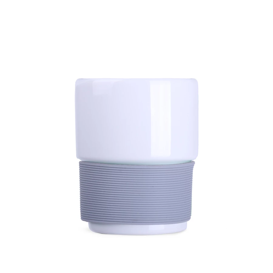 Ein Modell im Retrostil mit einfachem Design, hergestellt aus europäischem Porzellan. Seine Form ermöglicht das Stapeln. Der Becher ist mit einem 40 mm dicken Gummiband versehen, das in Farben erhältlich ist und Ihre Hände vor Verbrennungen schützt.
