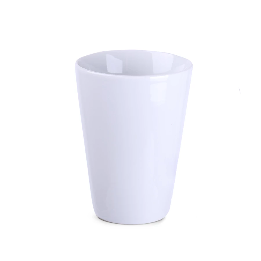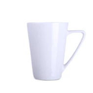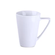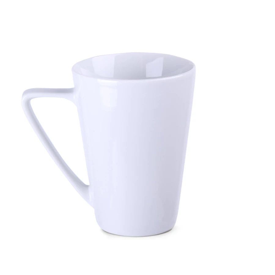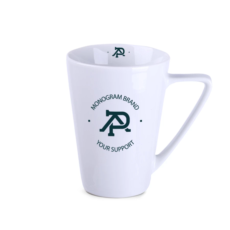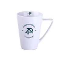 Ein geräumiger Becher mit geometrischer Form des Korpus und des Henkels. Hergestellt aus hochwertigem Porzellan. Perfekt zum Aufbringen umfangreicher Dekorationen.