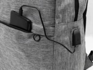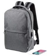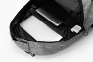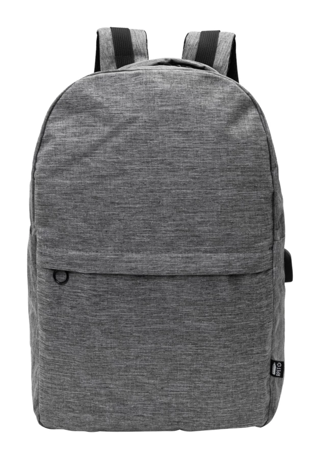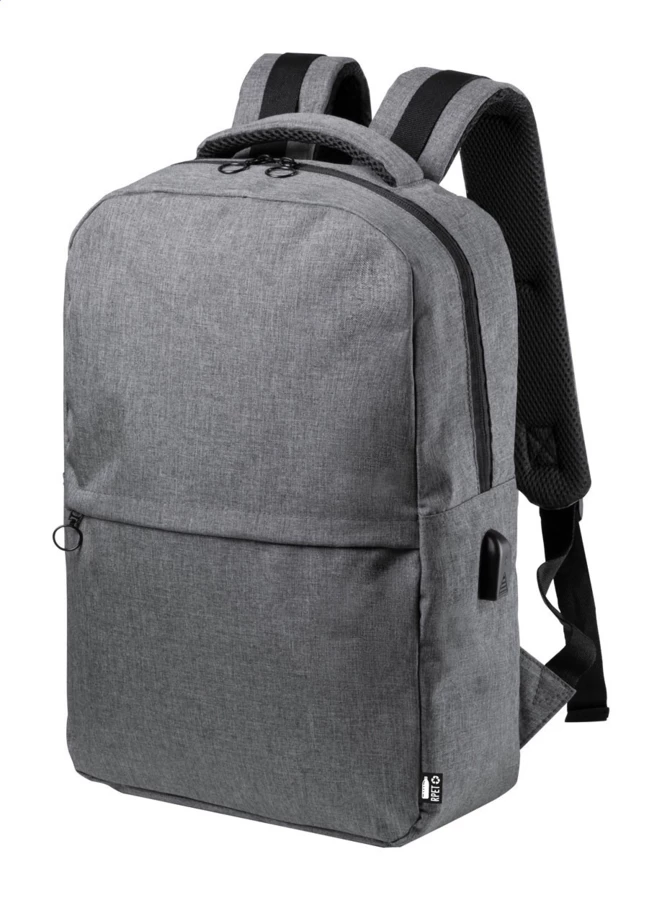 Rucksack mit Reißverschlussfächern, gepolstertem Laptopfach (15") und Tabletfach (10"), gepolstertem Rücken und Schultergurten. Mit eingebautem USB-Anschluss für Powerbanks. Material: 600D RPET-Polyester. Mit RPET-Label.