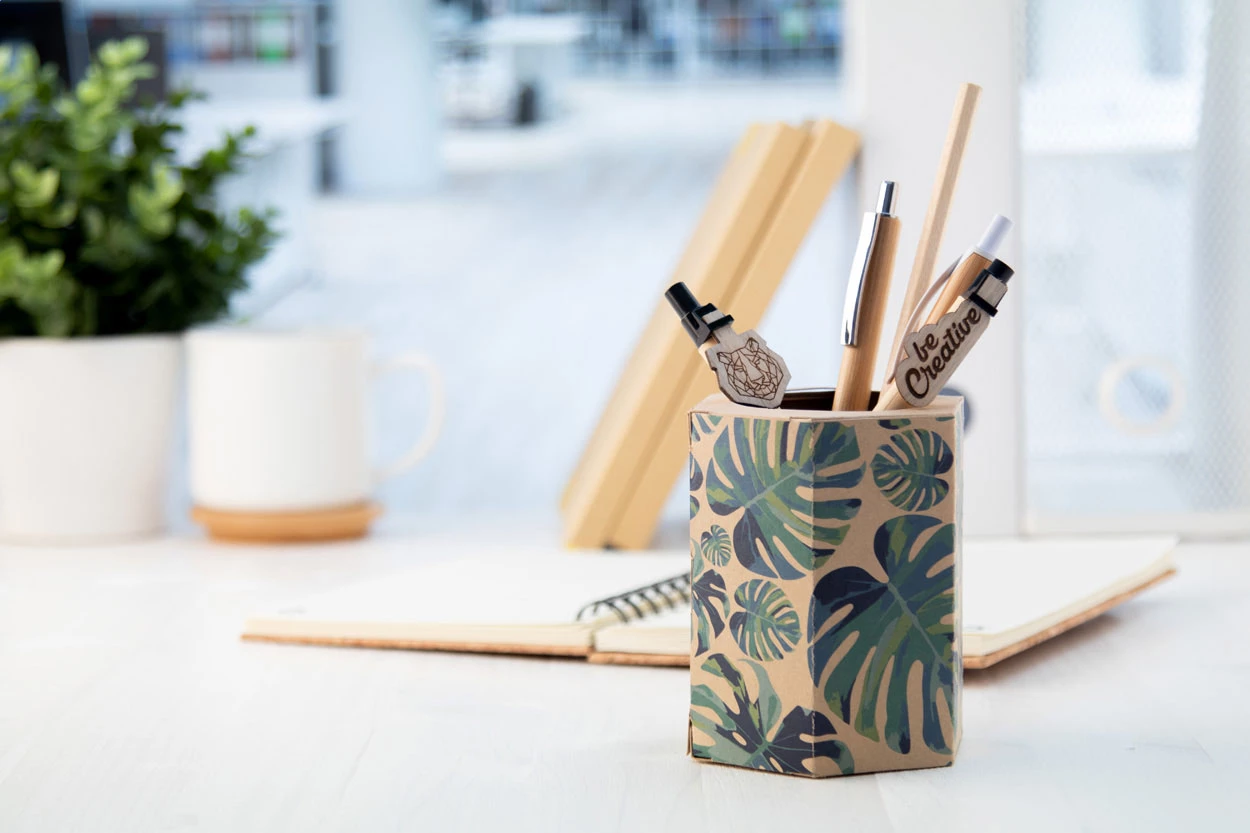 Individueller, sechseckiger Stifteköcher aus Kraftpapier. Preis inkl. Vollfarbdruck. Die Lieferung erfolgt flach verpackt. Mindestmenge: 100 Stk.
