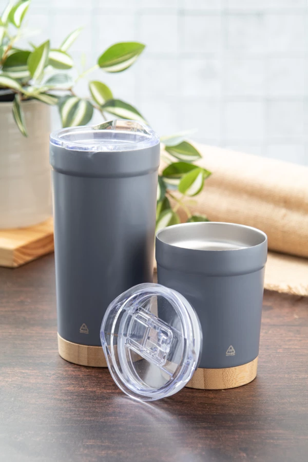 Doppelwandiger Vakuum-Thermobecher aus recycletem Edelstahl mit Bambusboden und Trinkdeckel aus AS Kunststoff. Füllmenge: 600 ml.