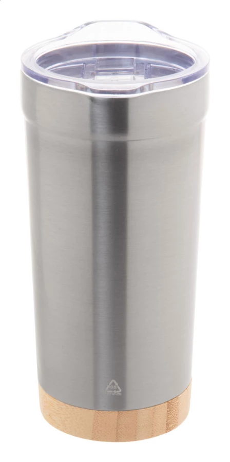 Doppelwandiger Vakuum-Thermobecher aus recycletem Edelstahl mit Bambusboden und Trinkdeckel aus AS Kunststoff. Füllmenge: 600 ml.