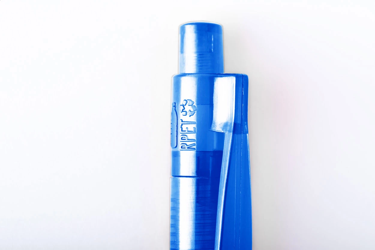 Transparenter Kugelschreiber aus RPET, blauschreibend.