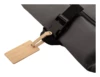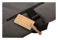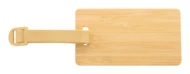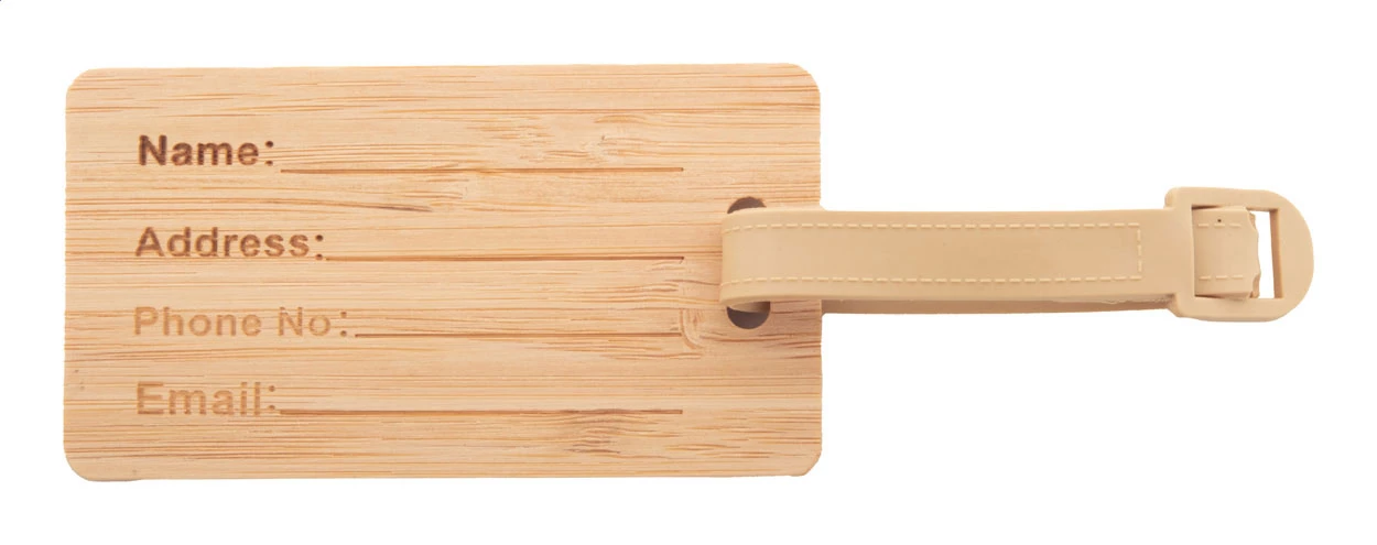 Kofferanhänger aus Bambus mit Kunststoffband und Schnalle.