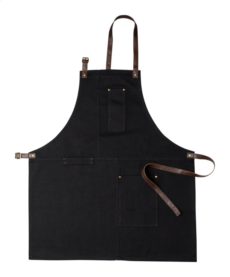 Schürze aus Baumwolle (340 g/m²) mit Brusttasche und einstellbaren Kunstlederriemen.