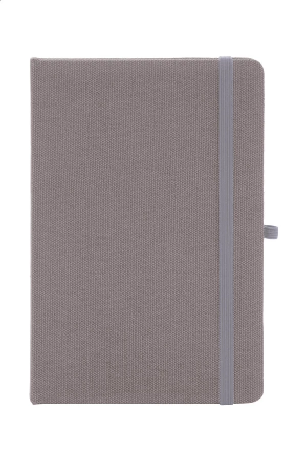 Notizbuch mit Einband aus recycelter Baumwolle und 80 linierten Blättern aus Recyclingpapier. Mit farblich passendem Lesezeichen, Gummiband und Stifthalter. A5-Größe.