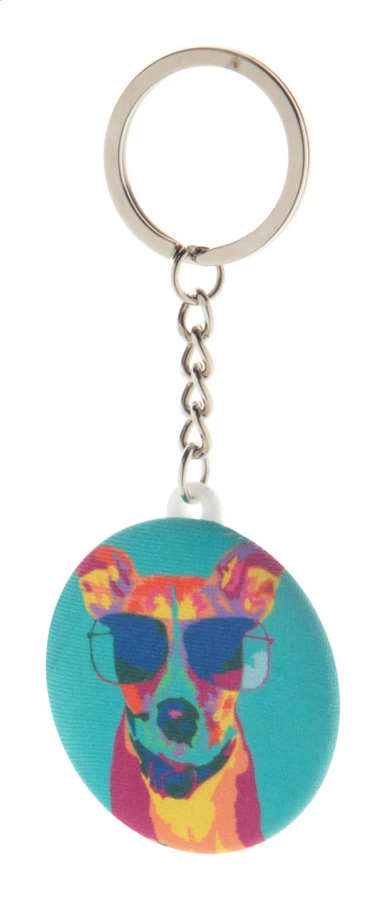Kleiner Pin-Button-Schlüsselanhänger mit vollfarbigem RPET-Mikrofaserbezug. Preis inklusive Sublimationsdruck. MOQ: 100 Stück.