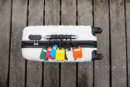 Kofferanhänger in Form eines Koffers mit einem Griff zur Befestigung am Koffer, mit viel Platz für Kontaktdaten