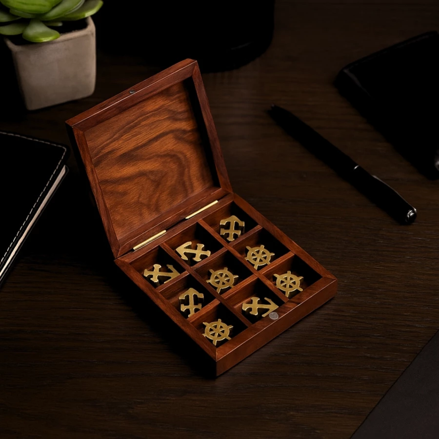 ·Elegancki i Unikalny Design: Drewniane koła sterowe i kotwice z mosiężnymi zdobieniami zastępują tradycyjne kółka i krzyżyki, a eleganckie pudełko dodaje grze szyku.