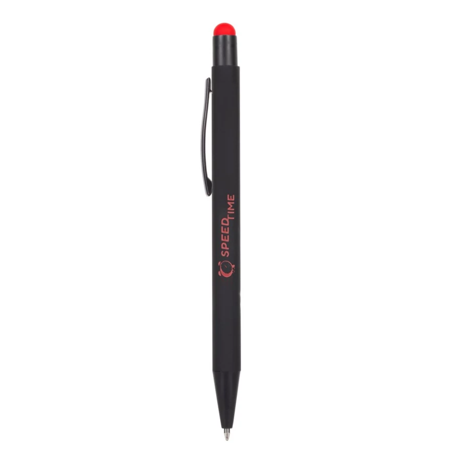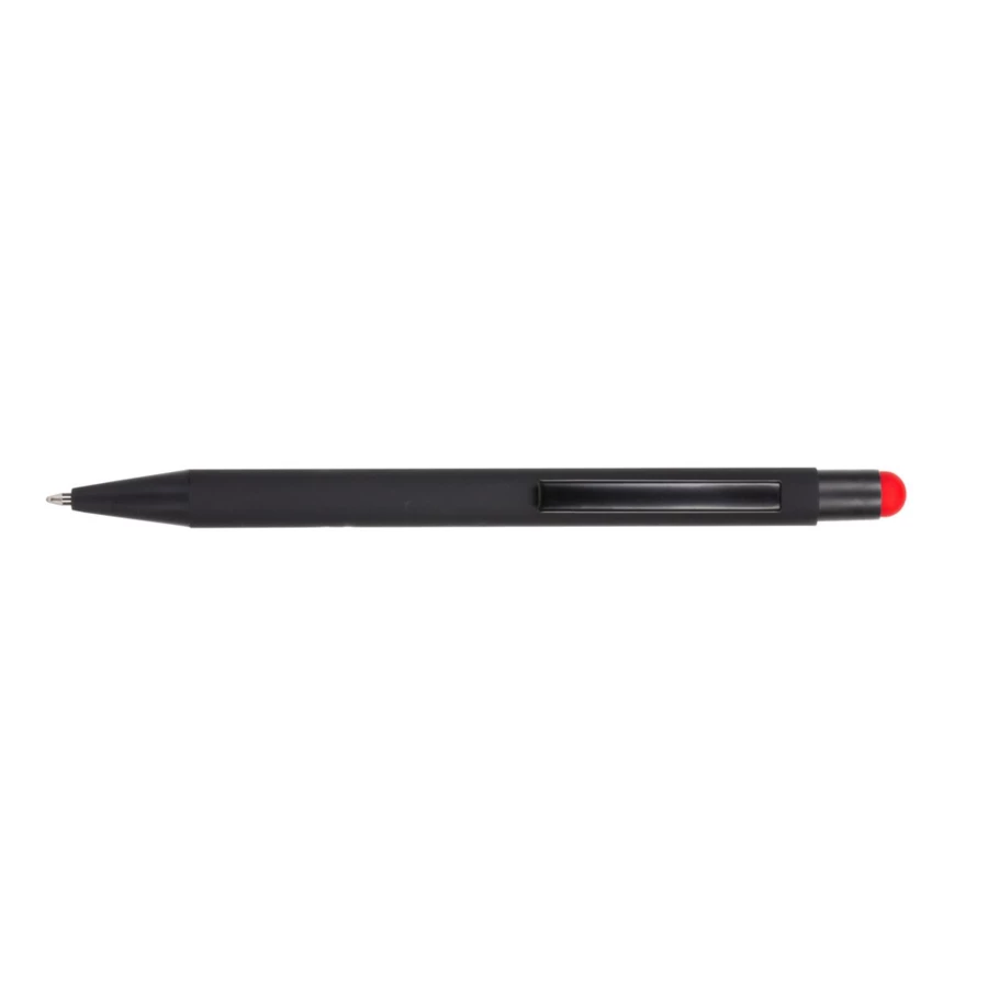 Kugelschreiber mit schwarzem Schaft, gummierte Oberfläche, farbige Stiftspitze ermöglicht Touchscreen-Bedienung, die gravierte Oberflächenfarbe kann weiß oder ähnlich der Stiftspitze sein, schreibt in blau, Produkt aus Aluminium
