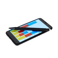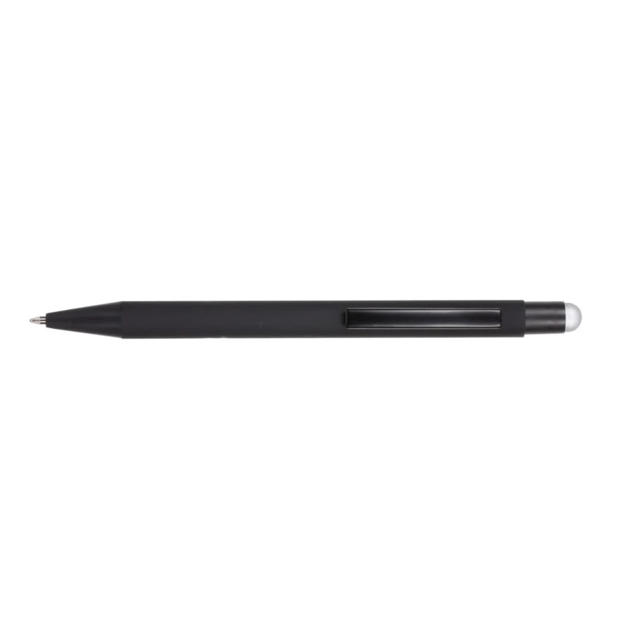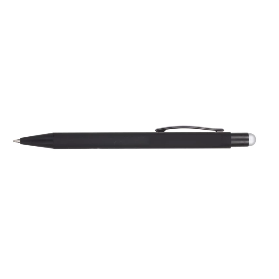 Kugelschreiber mit schwarzem Schaft, gummierte Oberfläche, farbige Stiftspitze ermöglicht Touchscreen-Bedienung, die gravierte Oberflächenfarbe kann weiß oder ähnlich der Stiftspitze sein, schreibt in blau, Produkt aus Aluminium