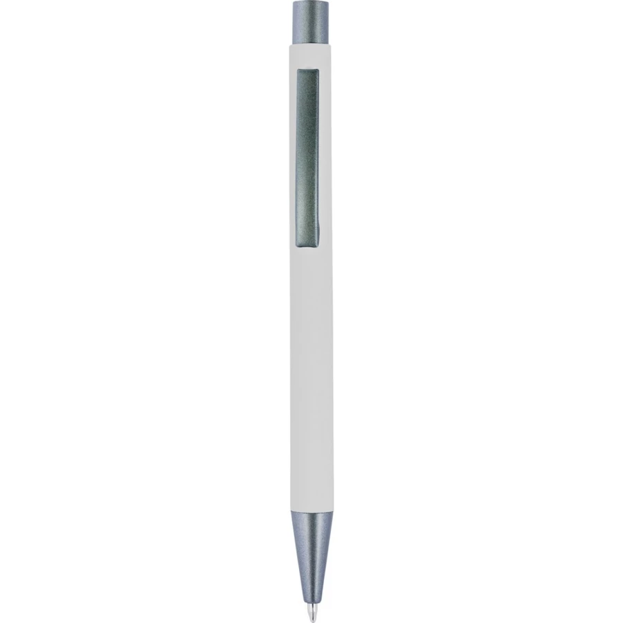 Kugelschreiber mit buntem, gummiertem Schaft und grauen Elementen, nach Eingravieren kommt Spiegeloberfläche heraus