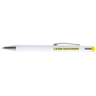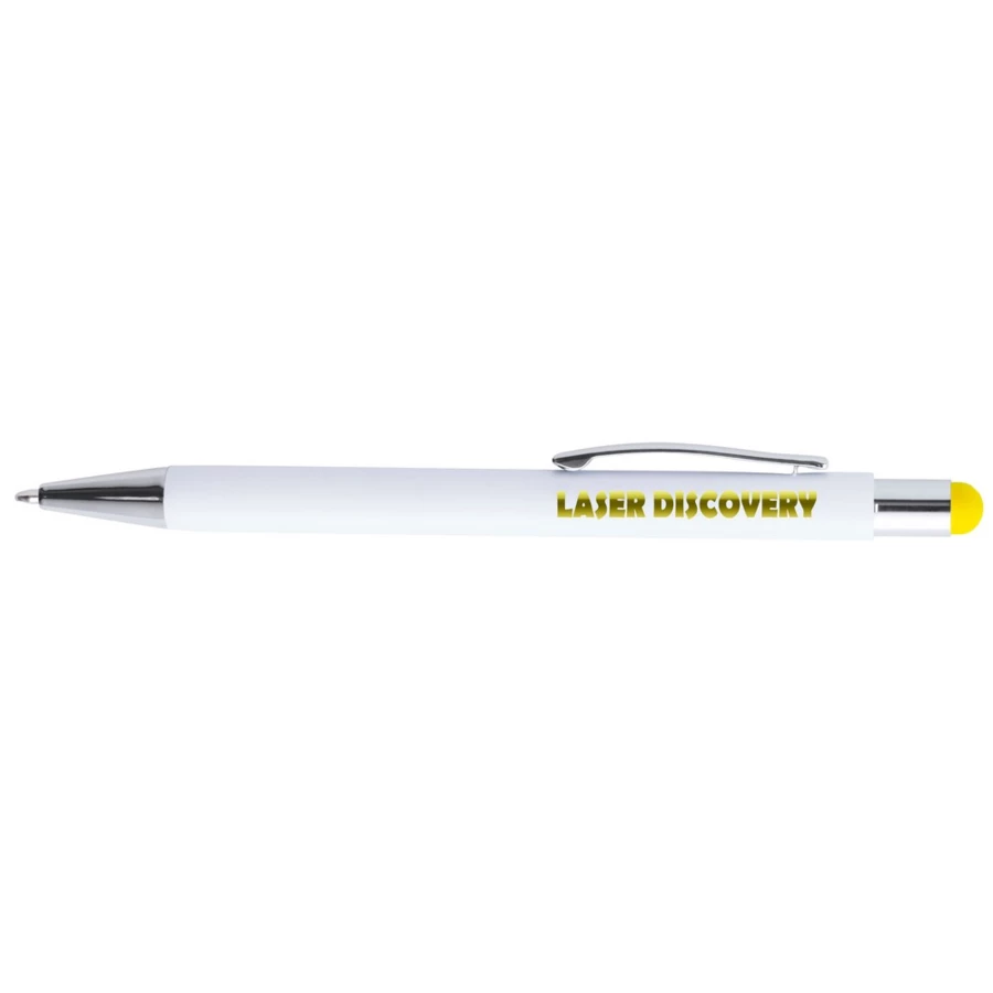 Kugelschreiber, Touch-Pen, weißer Schaft, matt, die Gravur zeigt Spiegelfläche in einer Farbe ähnlich der Gummispitze