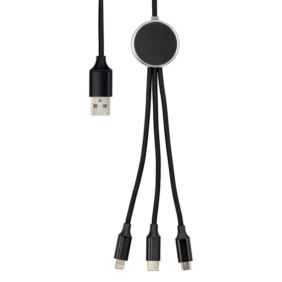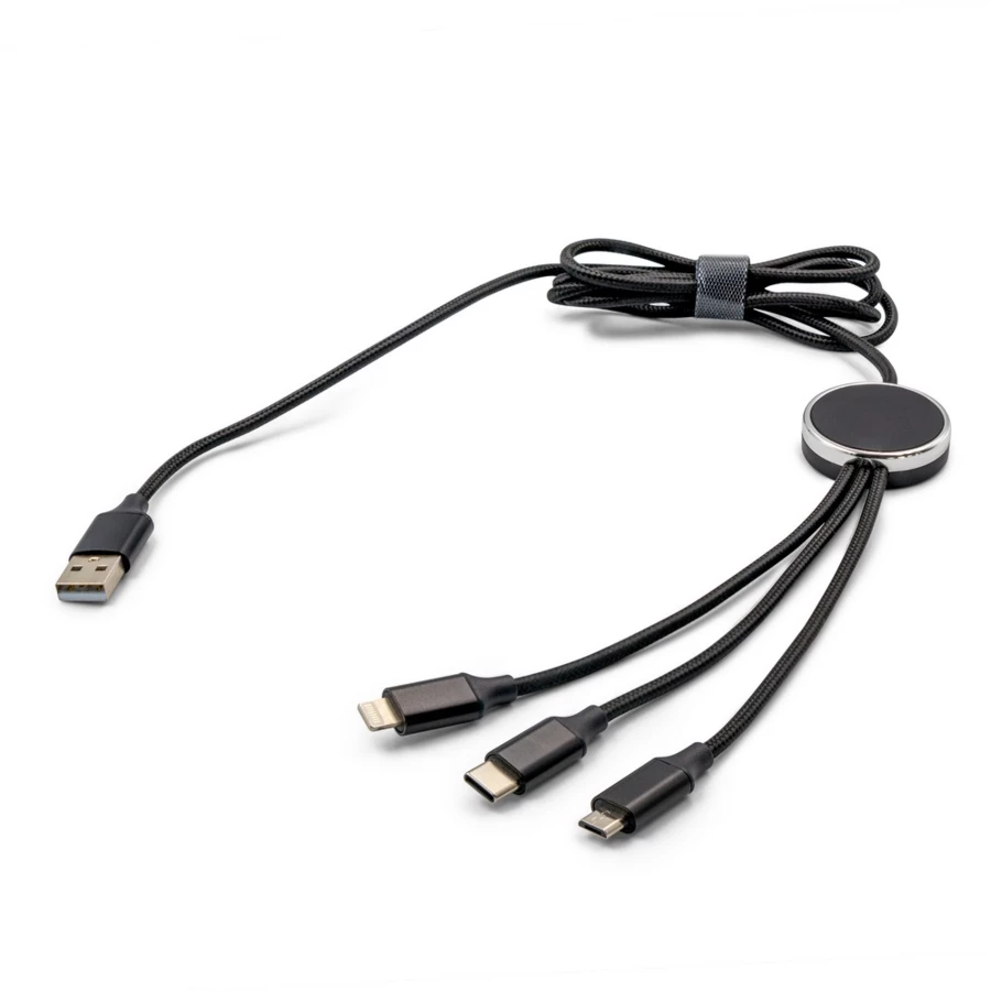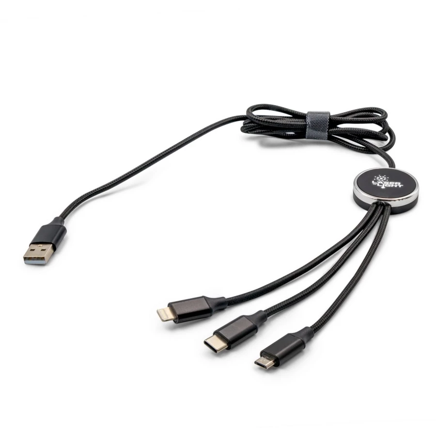 Exclusive Collection Ladekabel mit 5 Steckern: USB, 2x USB-C, Micro-USB und kompatibel mit iOS-Geräten, 5V/2.4A, maximale Ladeleistung USB-C zu USB-C 10 W, USB-C zu iOS 10 W, USB zu Micro-USB 10 W, 120 cm Länge, Beleuchtungseffekt nach Gravur
