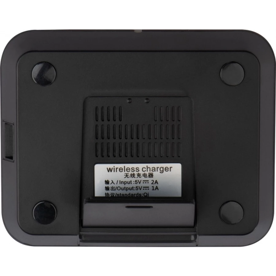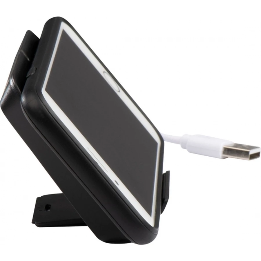 Ładowarka indukcyjna (QI standard) z plastiku. Może służyć także jako stojak na telefon. Kabel micro USB w zestawie. Moc wejściowa: 5V/2A, moc wyjściowa 5V/1A.