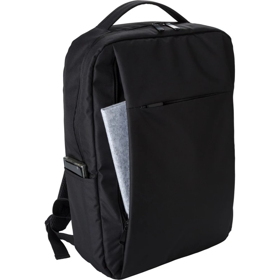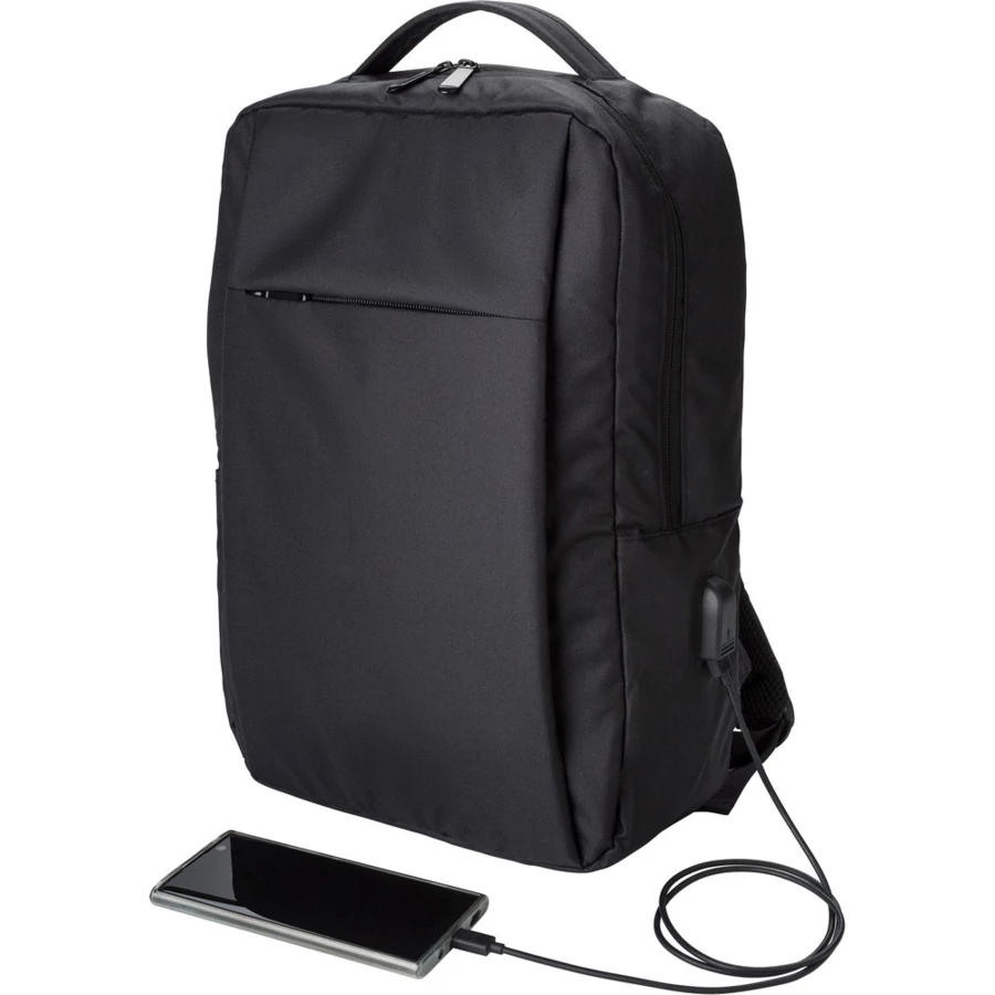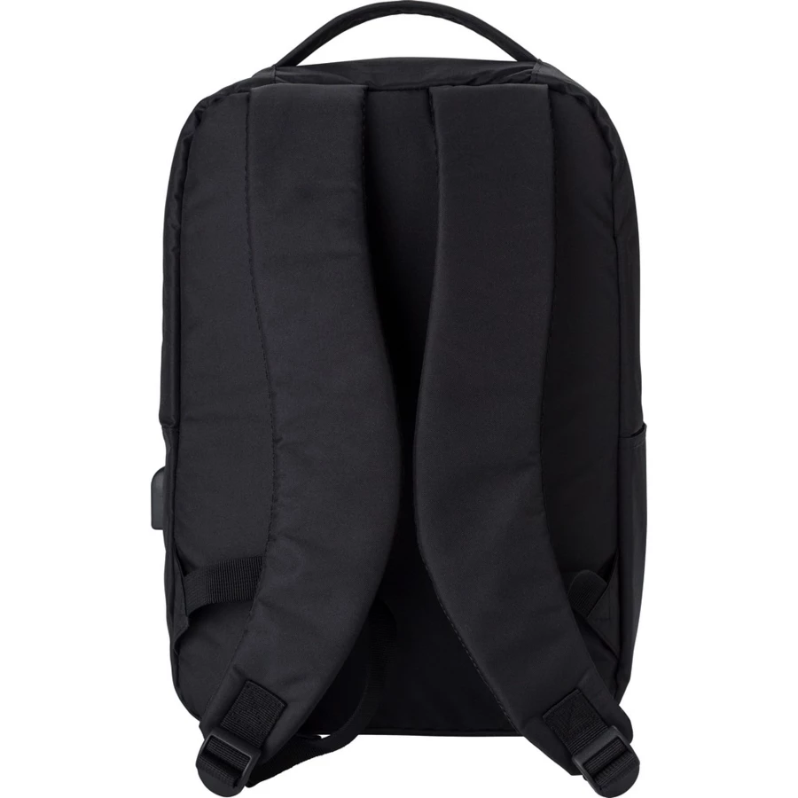 Rucksack für 16" Laptop, aus RPET, Hauptfach und Fronttasche mit Reißverschluss, weiches Laptopfach, verschiedene Fächer im Inneren, integrierter USB-Anschluss zum Aufladen von Handys (Powerbank nicht im Lieferumfang enthalten), Seitentasche, verstellbare Schultergurte