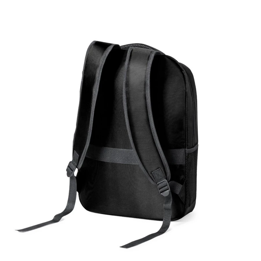 Rucksack aus recyceltem Nylon mit Fach für Laptop 15", Hauptfach mit Reißverschluss und Fronttasche, 2 seitliche Netztaschen, Riemen zur Befestigung am Trolley-Griff, gepolsterter Rücken und verstellbare Schultergurte