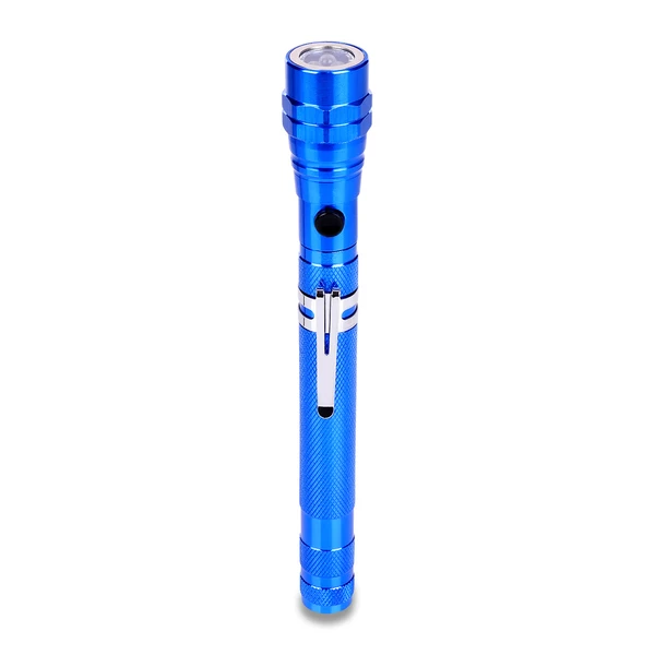 Metalowa wysuwana latarka. Teleskop o długości 38,5 centymetrach Wyposażona w 3 białe diody LED, o sumarycznym strumieniu światła 10 lumenów. Zaopatrzona w klips oraz magnesy na obu końcach. Zasilana 4 bateriami typu AG13 (w cenie produktu).