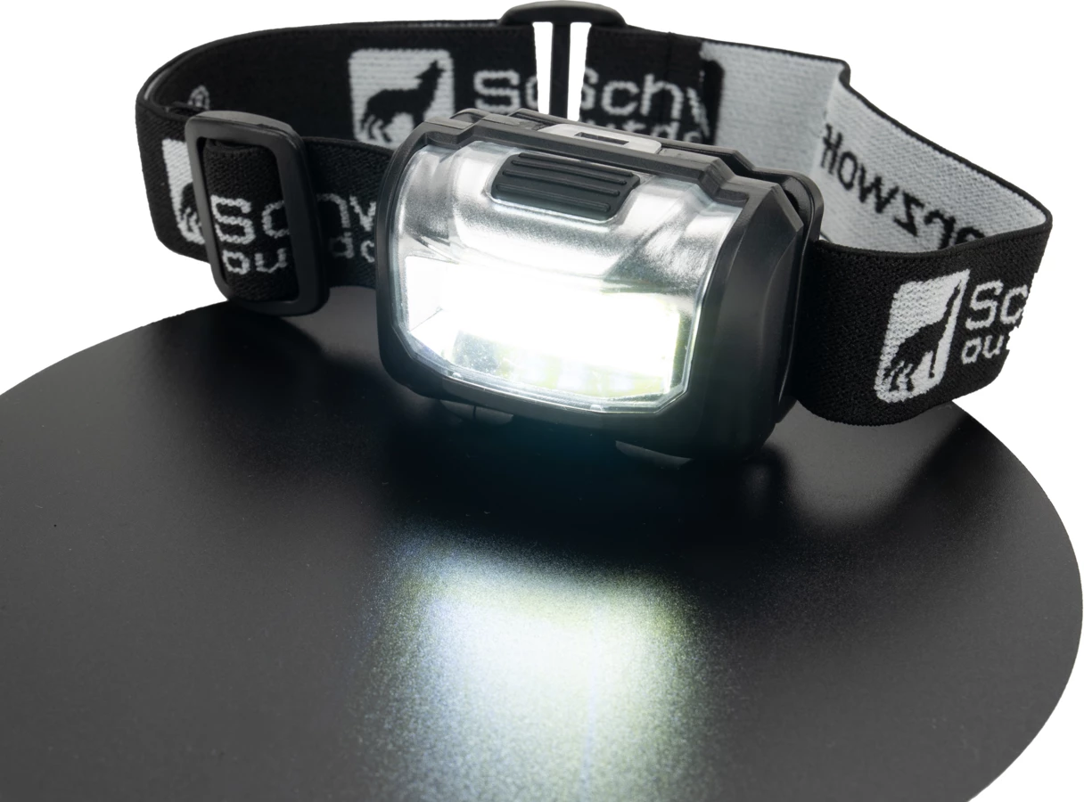 Latarka na głowę marki Schwarzwolf z diodą COB. Posiada trzy tryby świecenia: słabe światło, mocne światło, miganie. W zestawie z regulowaną gumką na głowę z logo Schwarzwolf (gumkę można ściągnąć, rozmiar max. długość 49cm, szerokość 2,5 cm). Jasność: 120 lumenów. Baterie 3xAAA w zestawie.