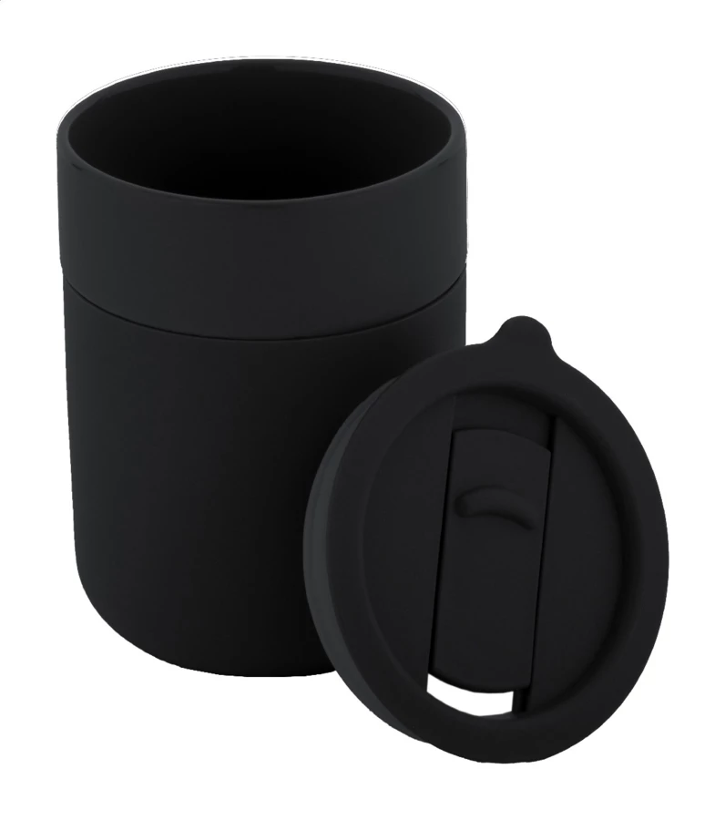 Reisebecher aus Keramik mit Silikonummantelung mit Trinkdeckel aus PP Kunststoff. Füllmenge: 300 ml.