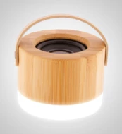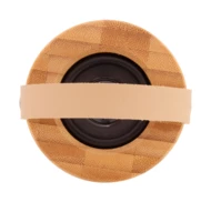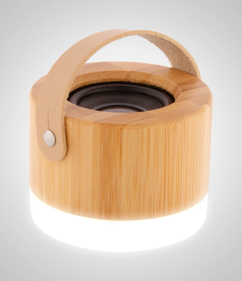 Kabelloser Lautsprecher in einem Gehäuse aus Bambus und ABS-Kunststoff mit LED-Licht an der Unterseite, Tragegurt aus PU-Leder und eingebautem Akku. Inklusive USB-Ladekabel.