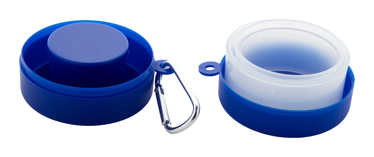 Faltbarer Becher aus recyceltem PP-Kunststoff mit Pillendosefach und Metallkarabiner. Füllmenge: 220 ml. BPA-frei.