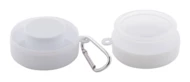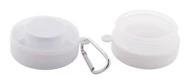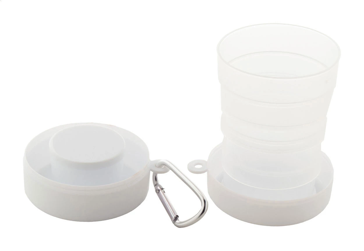 Faltbarer Becher aus recyceltem PP-Kunststoff mit Pillendosefach und Metallkarabiner. Füllmenge: 220 ml. BPA-frei.