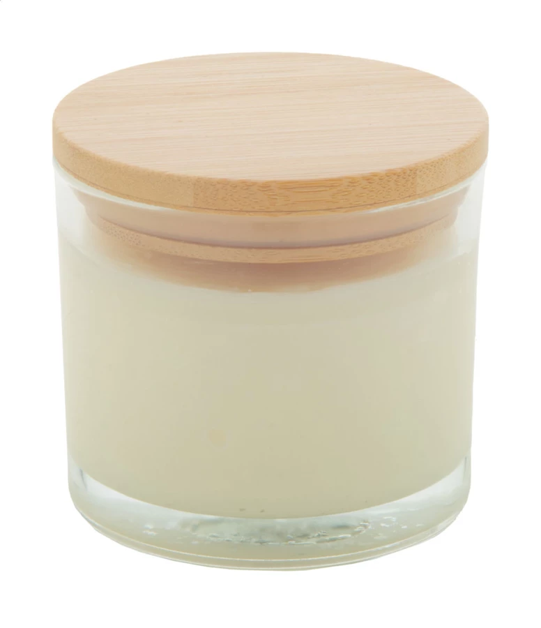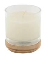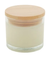 Vanille-Duftkerze aus pflanzlichem Wachs mit Bambusdeckel. Mit 95 g Wachs. Einzeln in Kraftpapierbox.