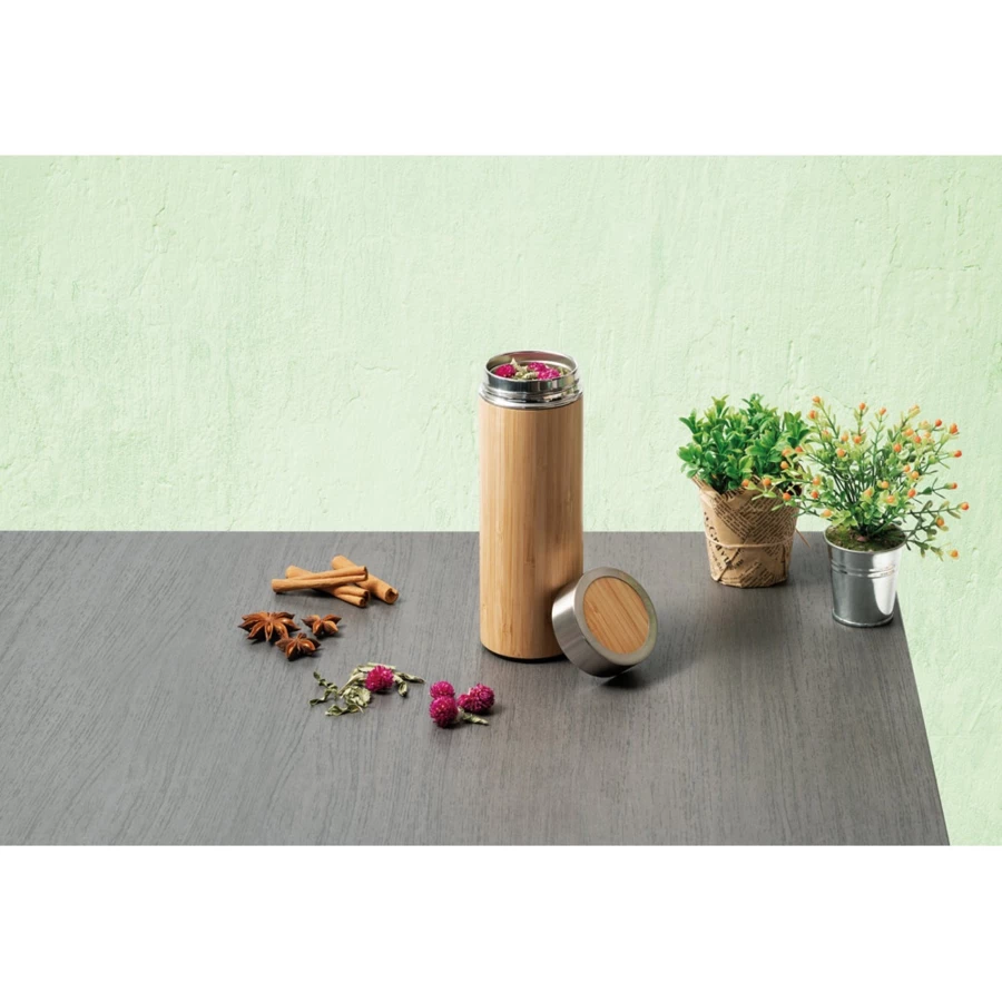 Isolierkanne aus Bambus und Edelstahl (90% recycelt) (430 mL), doppelwandig, vakuumisoliert und mit Teesieb. Geliefert in einer Geschenkschachtel. Da das Produkt aus natürlichen Materialien hergestellt wird, können Farbe des Produkts sowie das Druckergebnis von Produkt zu Produkt unterschiedlich sein. ø69 x 207 mm | Schachtel: 72 x 210 x 72 mm