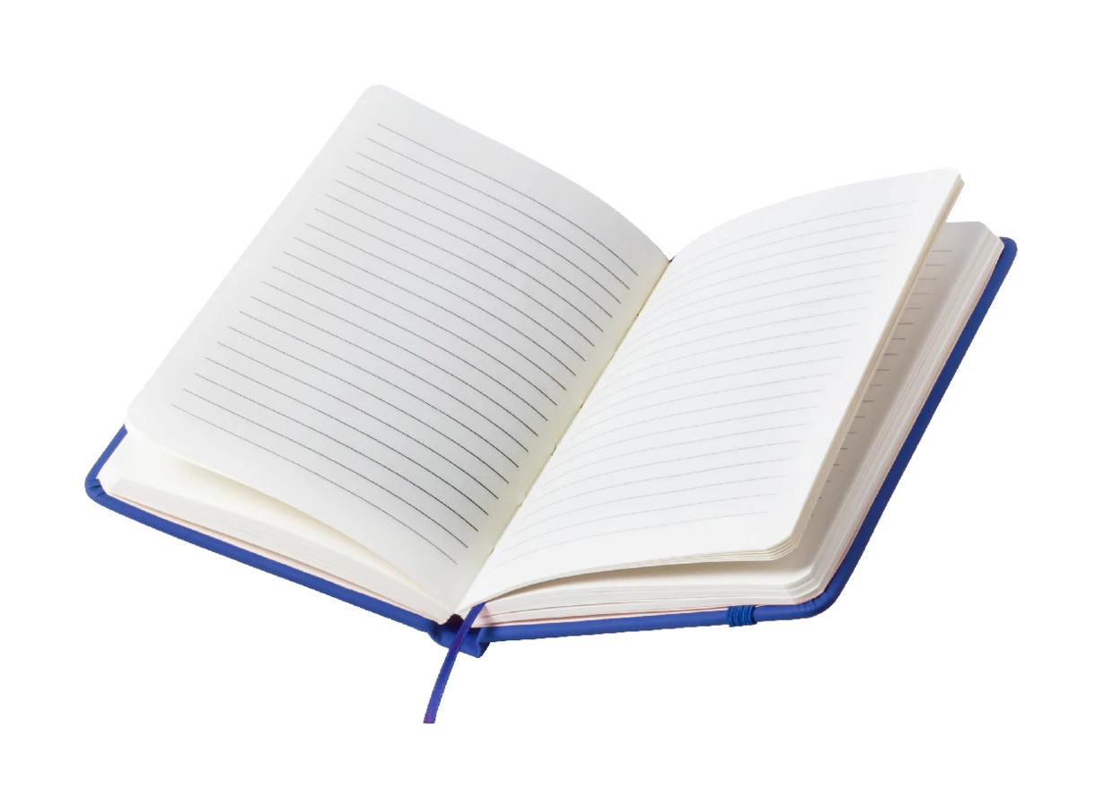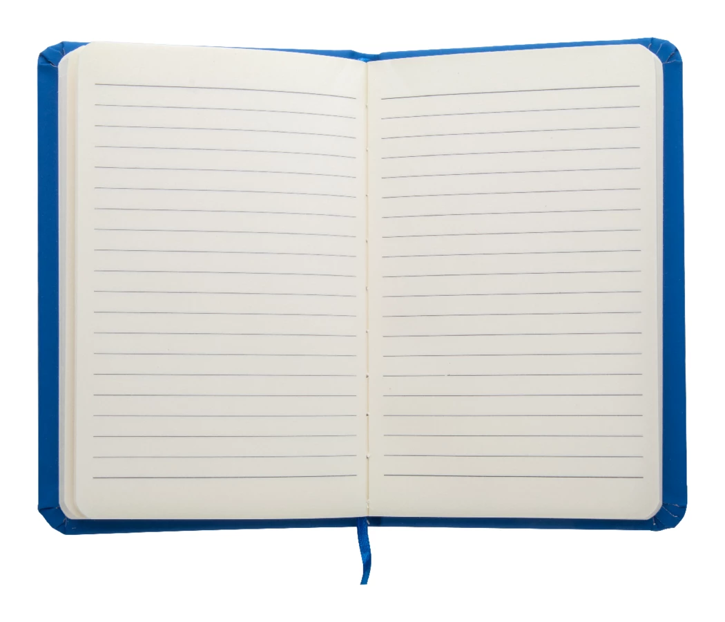 Notizbuch mit Kunstleder-Einband, 100 Seiten (liniert) mit Lesezeichen und Gummiband. A6-Größe.