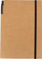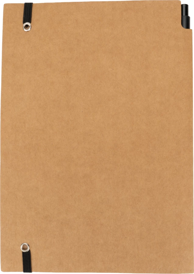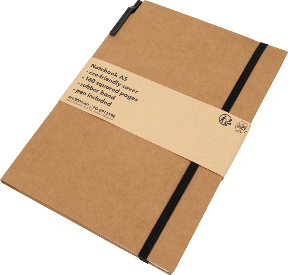 Notes (160 stron w kratkę) z ekologiczną okładką z kartonu i gumką. W zestawie z długopisem.