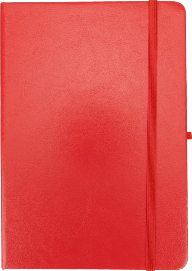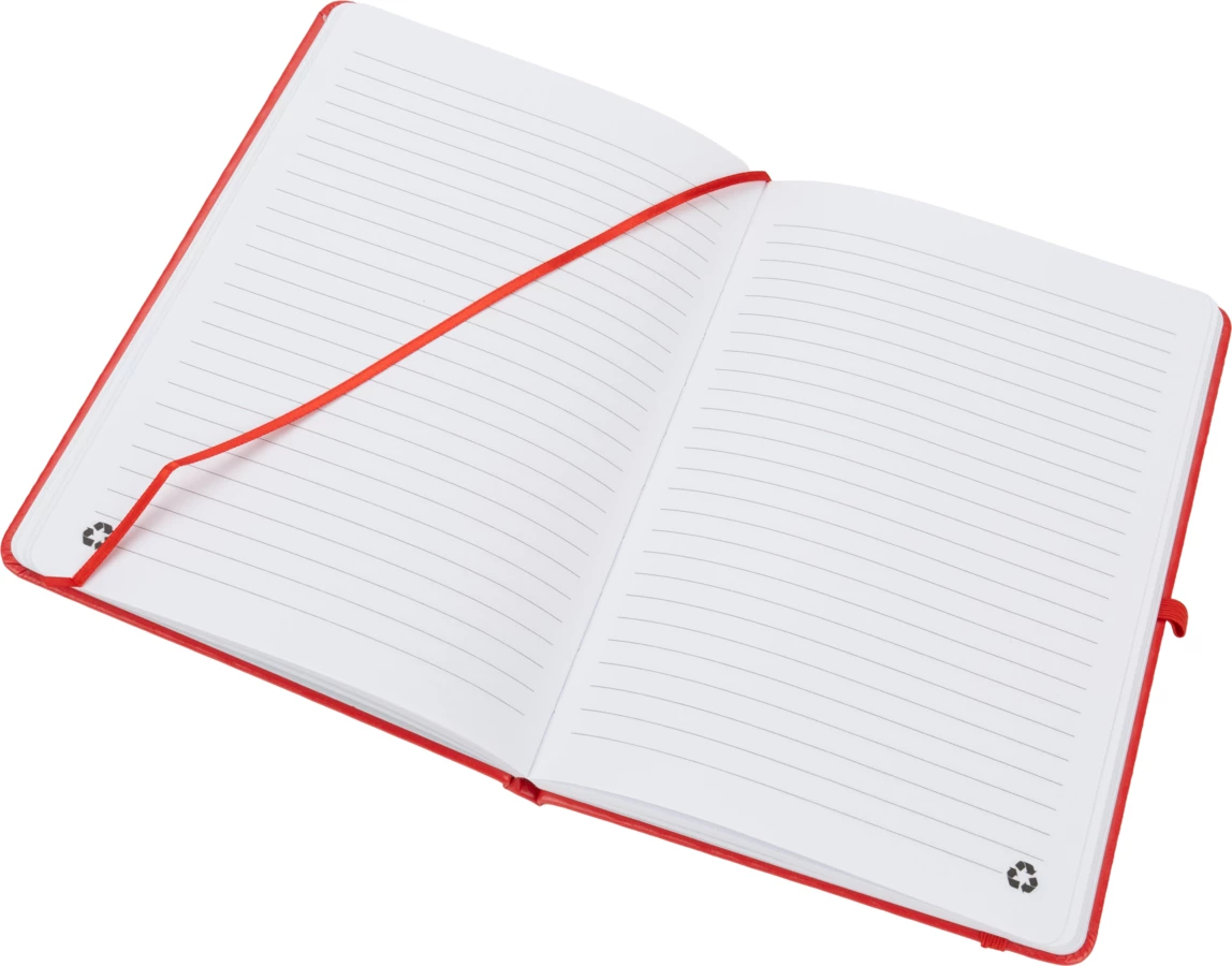 Notes o formacie A5, z okładką wykonaną z PU pochodzącego z recyklingu, posiada 192 strony w linie, zamknięcie na gumkę, materiałową zakładkę i pętelkę na długopis.