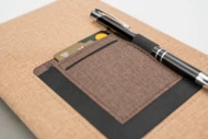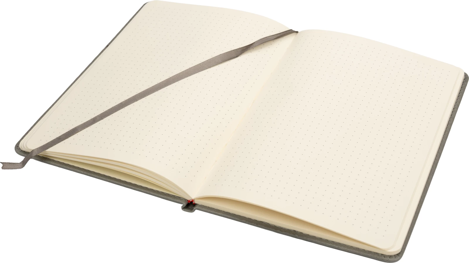 Elegancki notes o formacie A5 ze 160 stronami w kropki, zakładką oraz pętelką na długopis. Na okładce znajduje się kieszonka na telefon.