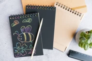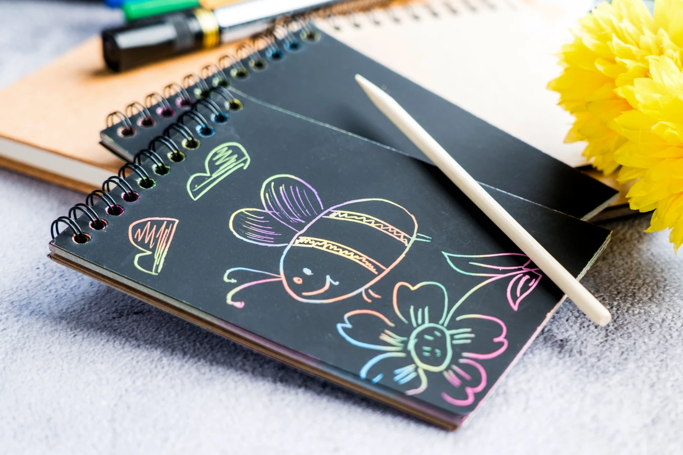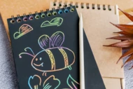 Notes z 10 czarnymi kartkami, ukrywa magiczne tło, wystarczy tylko użyć patyczka, rysika, wydrapać wzorek, rysunek, aby powstał uroczy obrazek.