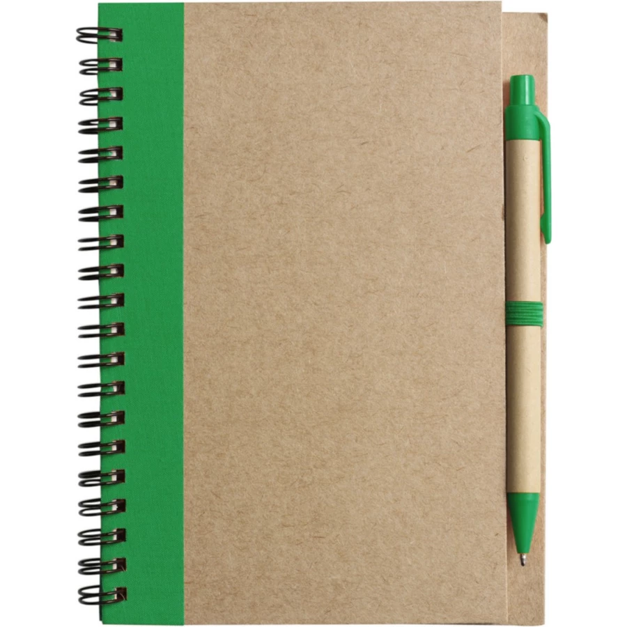 Notizbuch im Format ca. A5, mit 60 linierten Blättern (120 Seiten) und Spiralbindung, incl. farbigem Stift, blauer Mine, Umschlag aus Karton mit farbigem Element am Einband