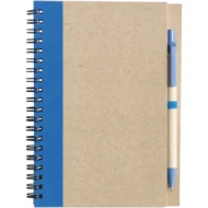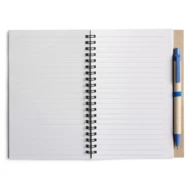 Notizbuch im Format ca. A5, mit 60 linierten Blättern (120 Seiten) und Spiralbindung, incl. farbigem Stift, blauer Mine, Umschlag aus Karton mit farbigem Element am Einband