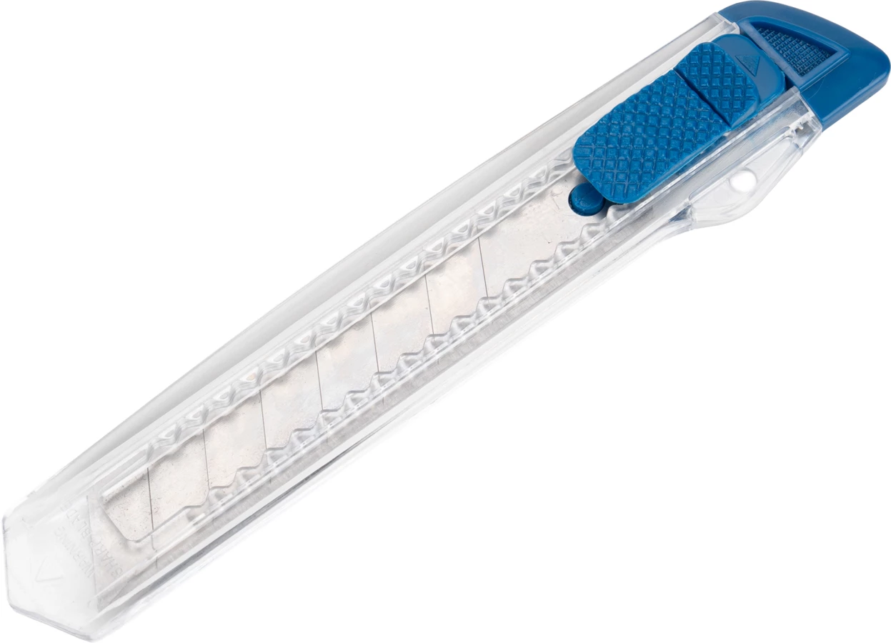 Transparentny nóż do kartonu z kolorową końcówką i łamanym ostrzem, w plastikowej obudowie.