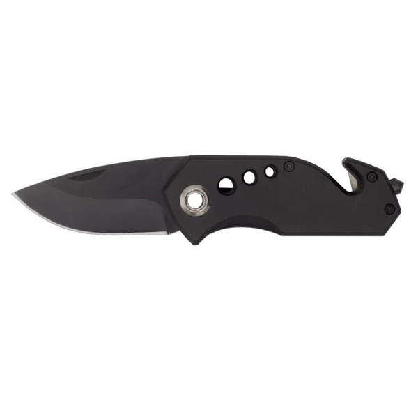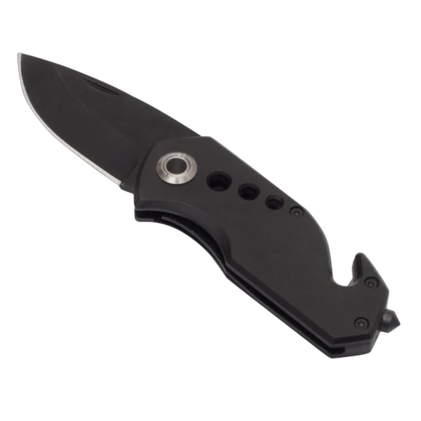 Wykonany z metalu 2CR13 składany nóż z ostrzem o długości 58 mm, blokadą ostrza, młotkiem do rozbicia szyb, przecinakiem do samochodowych pasów bezpieczeństwa i klipem do zaczepienia. Zapakowany w czarnym poliestrowym etui.
