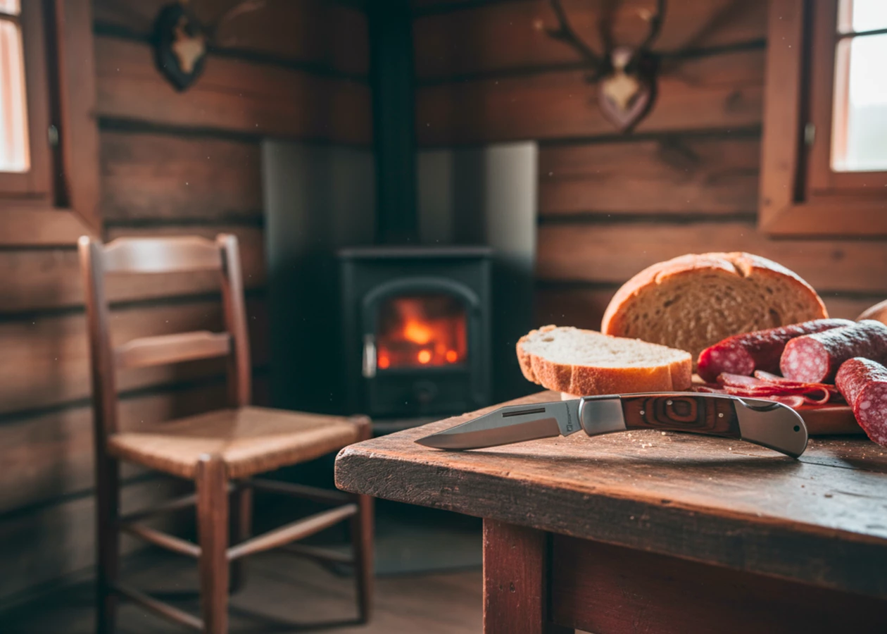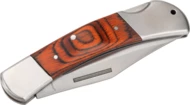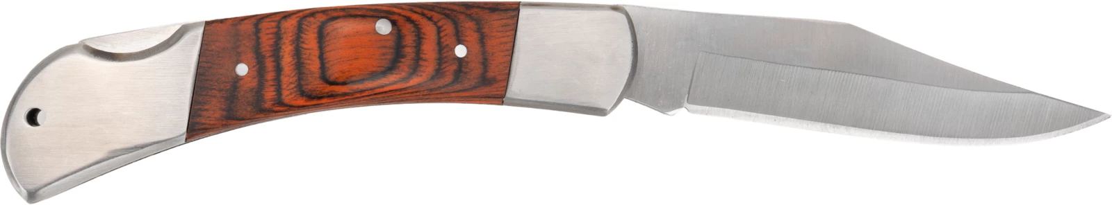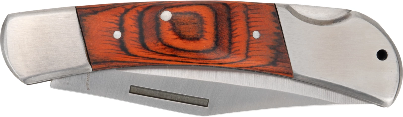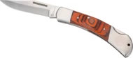 Składany nóż wykonany ze stali nierdzewnej, z drewnianą rękojeścią i blokadą bezpieczeństwa.