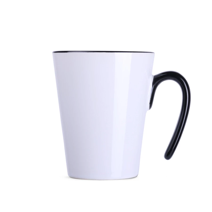 Eine originelle Tasse mit einem modernen "offenen" Henkel. Mit 4 Innenfarben zur Auswahl und einem passenden Henkel. Die konische Struktur ist ideal für große Dekorationen.