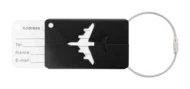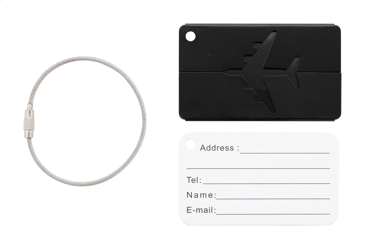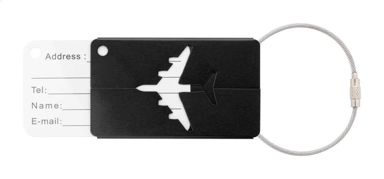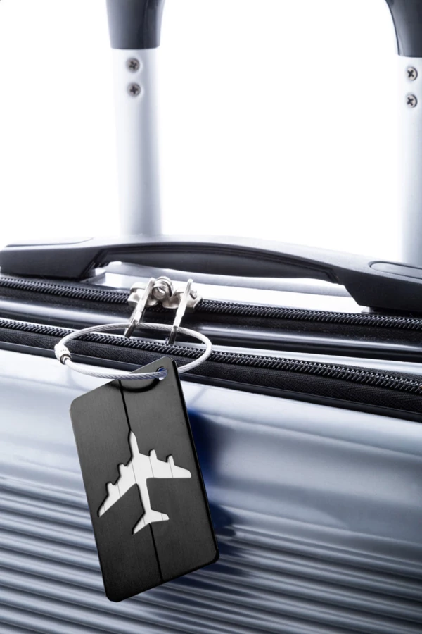 Kofferanhänger mit Flugzeugmotiv aus Aluminium und Schnur aus Metall.