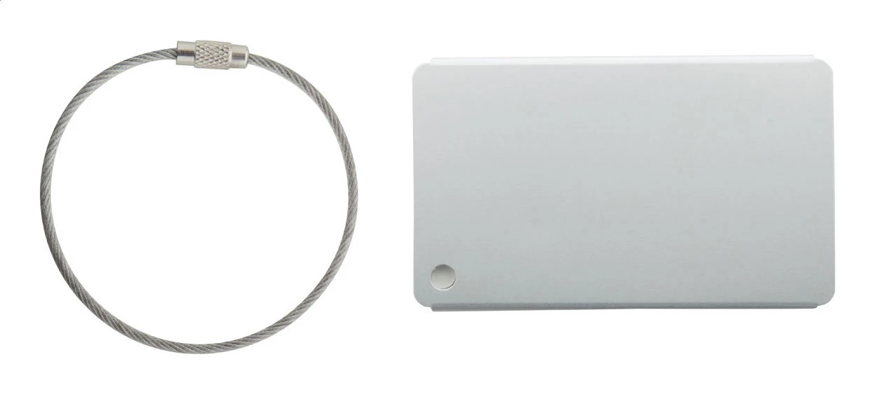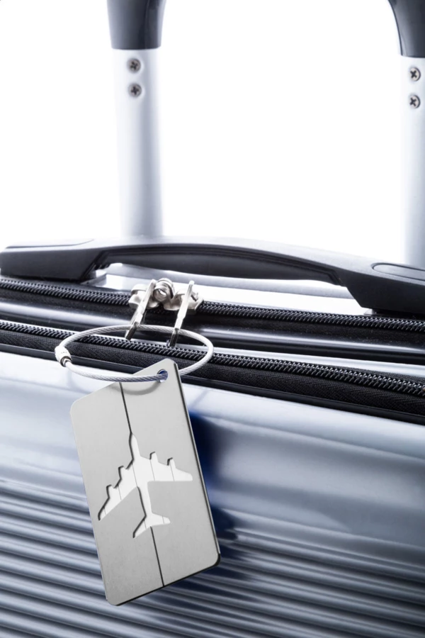 Kofferanhänger mit Flugzeugmotiv aus Aluminium und Schnur aus Metall.