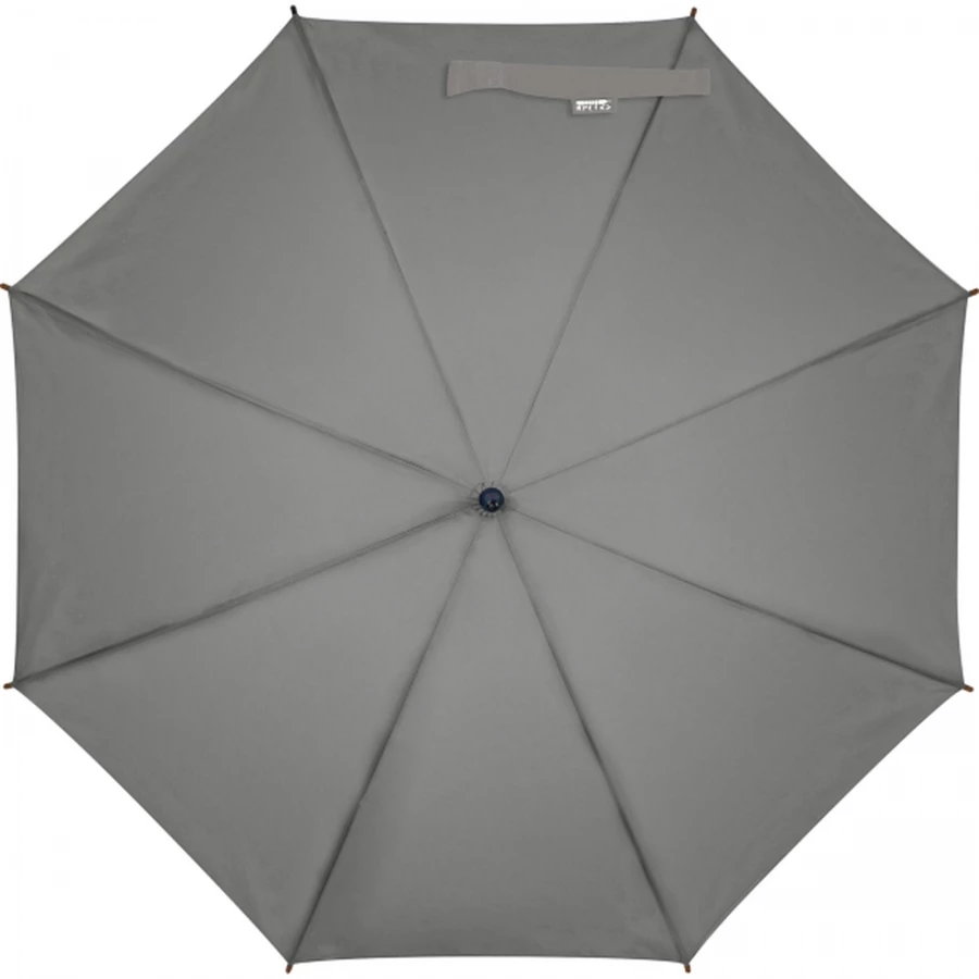 Automatyczny, wiatroodporny parasol, ze stelażem z włókna szklanego, panelami z poliestru RPET pochodzącego z recyklingu oraz zakrzywioną rączką z drewna.