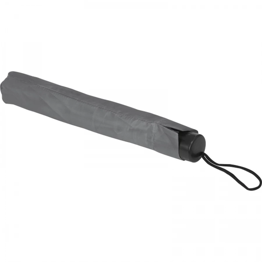 Ręcznie otwierany składany parasol kieszonkowy wykonany z poliestru, z elementami metalowymi i plastikowymi, z pokrowcem ochronnym.