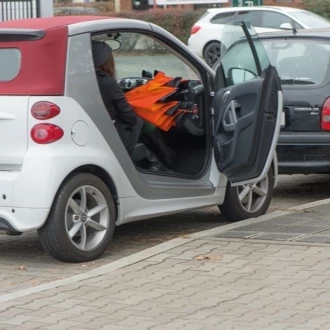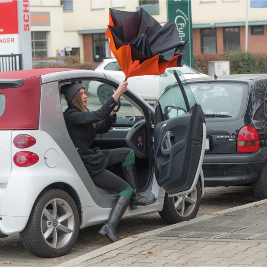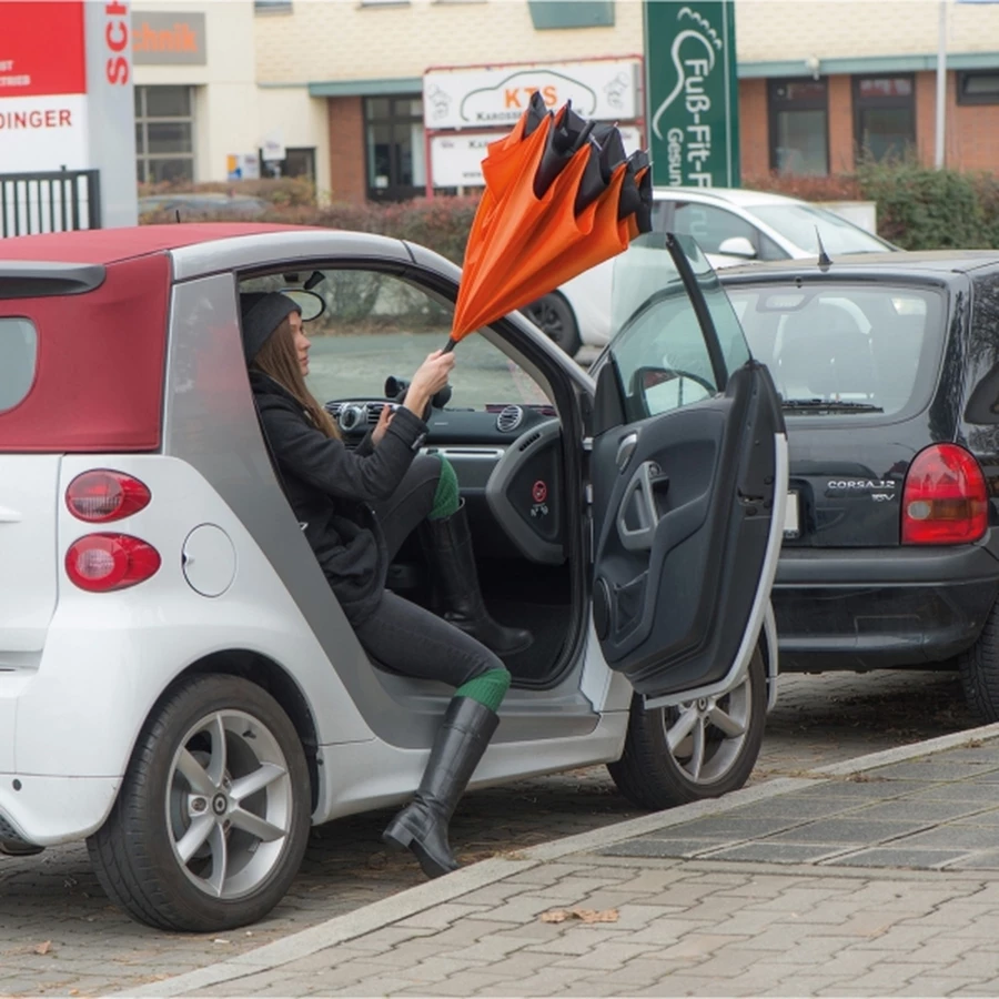 Parasol składany odwrotnie niż tradycyjny, dzięki czemu można np. bez problemu wsiąść do samochodu w trakcie deszczu. Parasol wykonany z podwójnej tkaniny typu pongee 190T i poliestru, posiada pasek na nadgarstek.