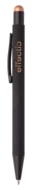 Aluminium-Kugelschreiber mit Touchpen und gummierter Oberfläche und Spezialbeschichtung für eine Farbgravur (Gravurfarbe abgestimmt mit Stylus), blauschreibend.