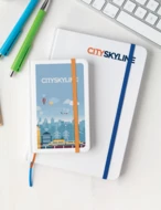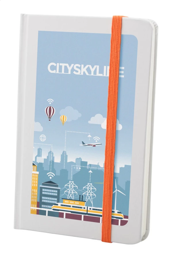 Notizbuch mit weißem Karton-Einband, 80 Seiten (blanko) und farbigem Gummiband. A6-Größe.