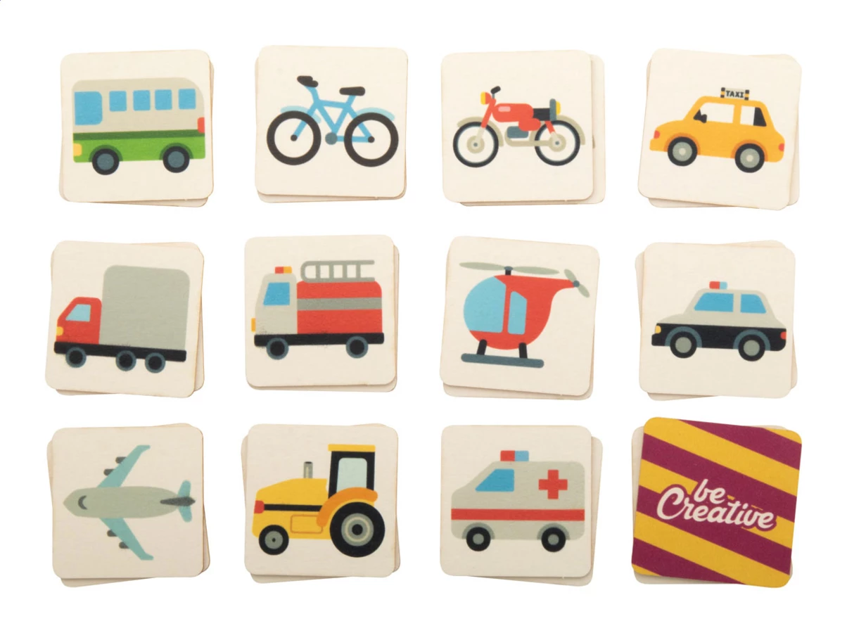 Memory-Spiel aus Pappe mit Motiven aus verschiedenen Themenbereichen und individueller Pappschachtel. Das Spiel beinhaltet 24 Kärtchen (40x40 mm). Der Preis ist inklusive 12 unterschiedlicher vollfarbiger Motive auf der Vorderseite der Kärtchen (je 2), einem vollfarbigen Motiv auf der Rückseite sowie vollflächig auf der Pappschachtel. Mindestmenge: 250 Stk.