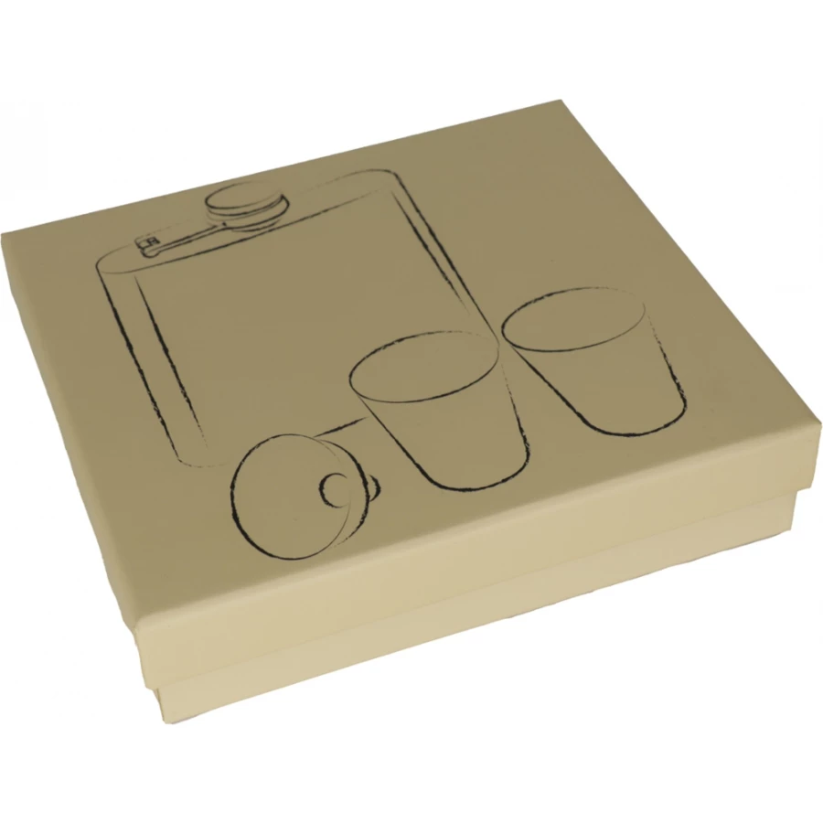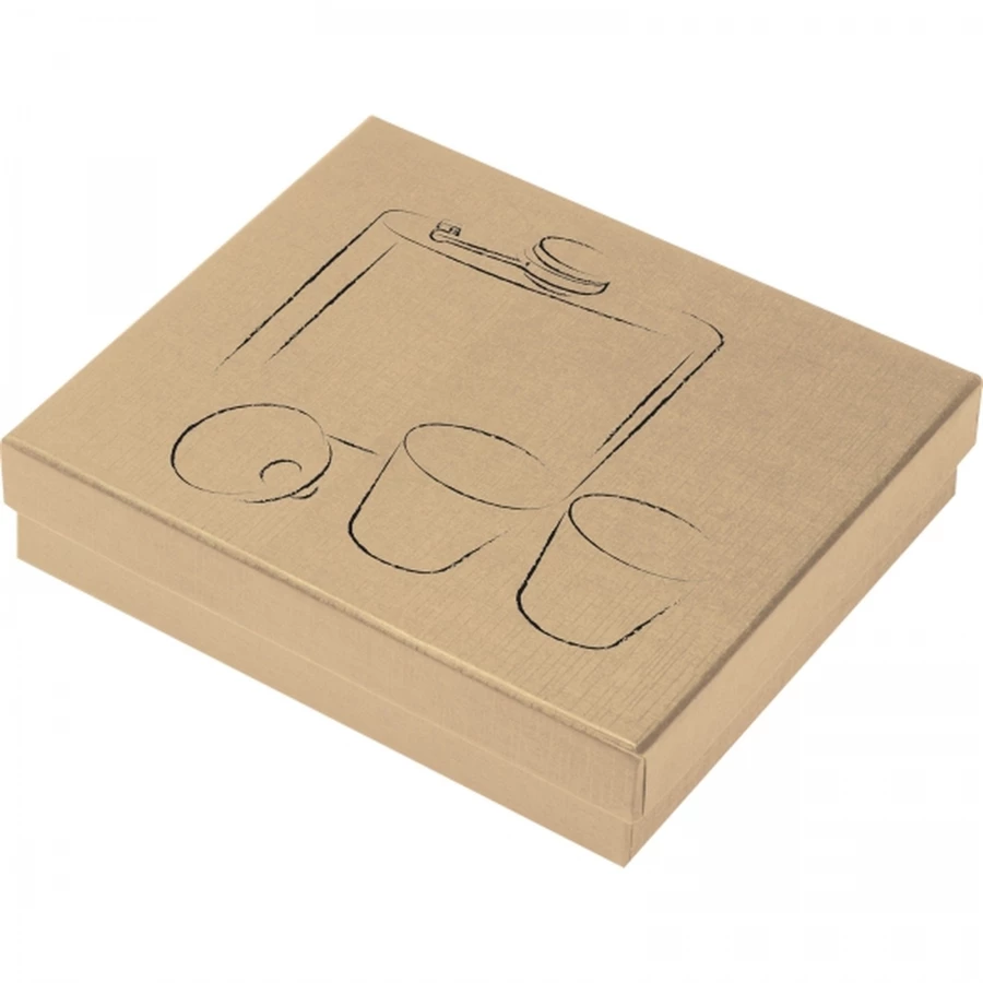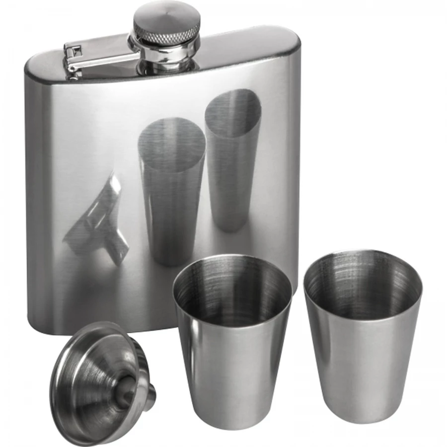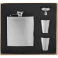 Klasyczna piersiówka wykonana ze stali nierdzewnej w zestawie z dwoma kieliszkami i lejkiem. Pojemność piersiówki: 178 ml, kieliszka: 45 ml.