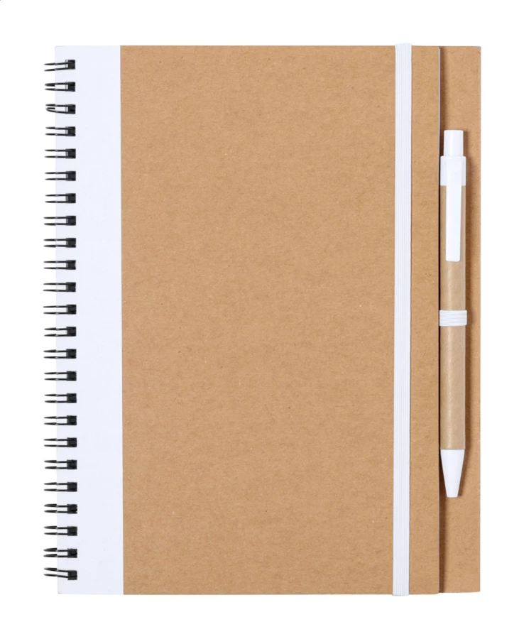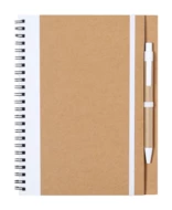 A5 Spiral-Notizbuch, 60 Seiten (blanko) und Kugelschreiber, blauschreibend, aus Recyclingpapier.